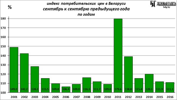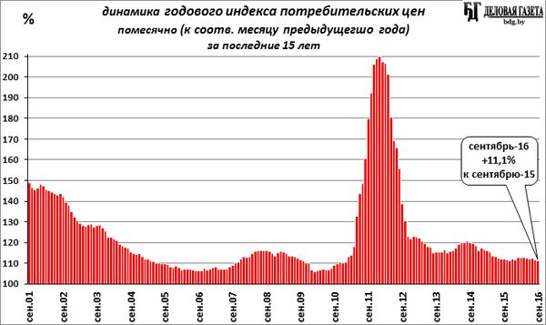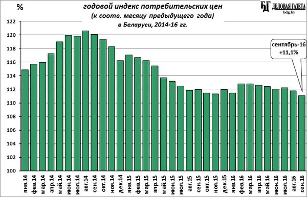 В сентябре месячная инфляция (к августу) составила в потребительском секторе 100,7% (после дефляции в прошлом месяце), с начала года, за 9 месяцев – 108,3% (за 8 месяцев было 107,6%), годовая инфляция (сентябрь 2016-го к сентябрю 2015-го) - 111,1% (месяц назад, август 2016-го к августу 2015-го – 111,8%), среднегодовая инфляция (средние за январь-сентябрь 2016-го цены к средним ценам за январь - сентябрь 2015-го) составила 112,1% (месяцем раньше было 112,3%).