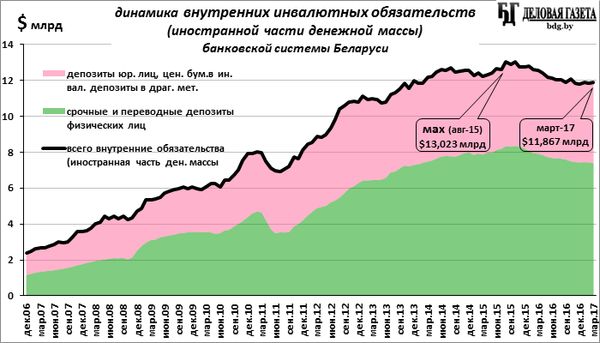 Внутренних обязательств банковской системы Беларуси в иностранной валюте больше , чем внешних: на конец марта их - $11,867 млрд (в основном это инвалютные депозиты населения и юридических лиц в банках).