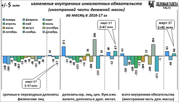 Но в последнее время они снижаются, особенно остатки депозитов населения: в прошлом году их становилось меньше с каждым месяцем: в марте 2017-го они снизились еще на $47 млн. Хотя остальных составляющих иностранной денежной массы стало за март больше на $87 млн (так, стало больше валюты на расчетных счетах (на $32 млн) и срочных депозитах (на $50 млн) юридических лиц). Поэтому в отчетном месяце внутренняя задолженность банковской системы выросла на $40 млн.