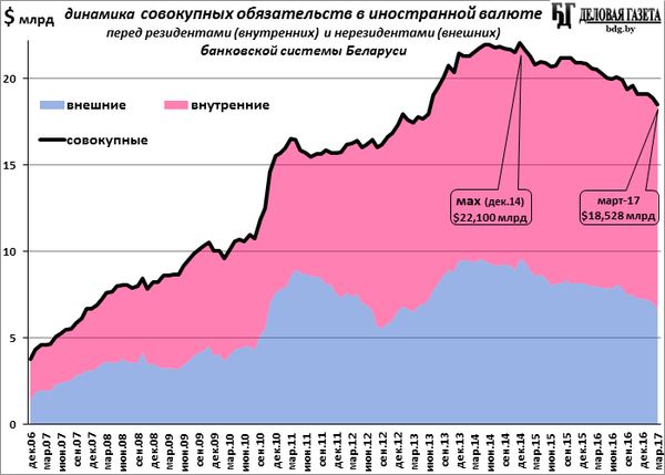 Если сложить внешнюю задолженность банковской системы (обязательства перед нерезидентами) и внутреннюю (перед физическими и юридическими лицами резидентами), то совокупная задолженность в иностранной валюте в конце марта 2017-го составит $18,528 млрд.