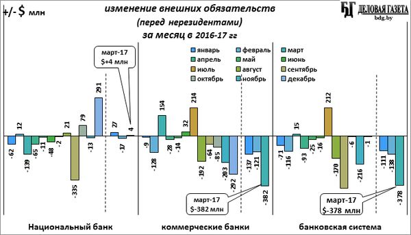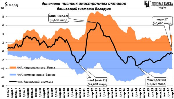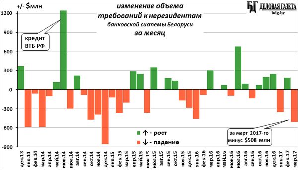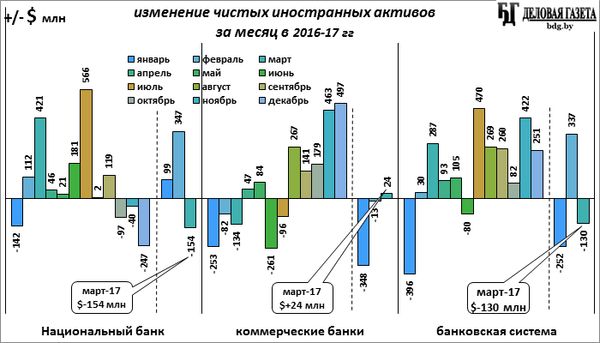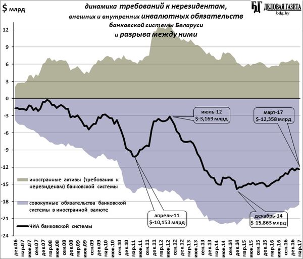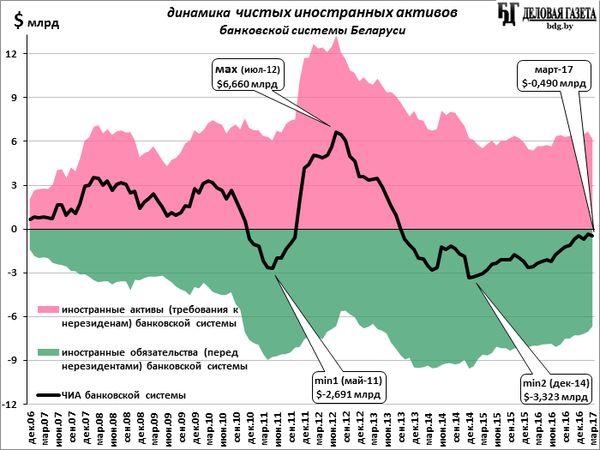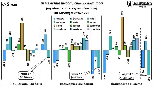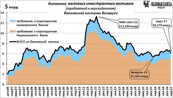 Требований к нерезидентам (а это – золото, иностранная валюта, депозиты за рубежом, кредиты нерезидентам, ценные бумаги иностранных эмитентов, СДР МВФ и прочие обязательства нерезидентов банковской системе Беларуси - то есть ликвидных иностранных активов, которые могут быть быстро использованы для обслуживания обязательств банковской системы в иностранной валюте) на конец марта 2017-го - $6,170 млрд.
