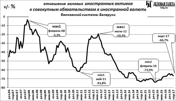 Ликвидность банковской системы в иностранной валюте как процентное соотношение требований к нерезидентам и совокупных, внешних и внутренних, валютных обязательств, составила в конце марта 2017-го – минус 66,7%: активов меньше обязательств в 3 раза.
