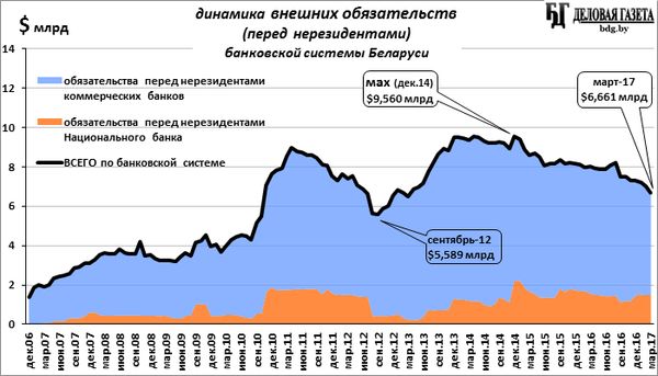 Обязательств белорусской банковской системы перед нерезидентами, внешних, на конец марта 2017-го - на $6,661 млрд. В эту сумму входят депозиты нерезидентов в белорусских банках, кредиты от нерезидентов, ценные бумаги белорусских банков “на руках” у нерезидентов и т.п.