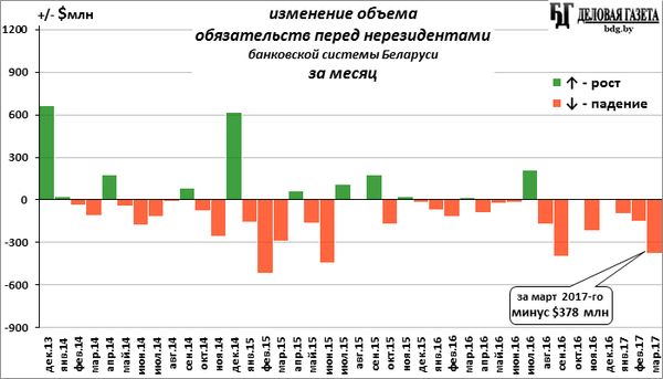 Мартовское снижение объема требований нерезидентов банковской системы Беларуси - самое значительное месячное падение показателя за более чем 2 года, с декабря 2014-го.