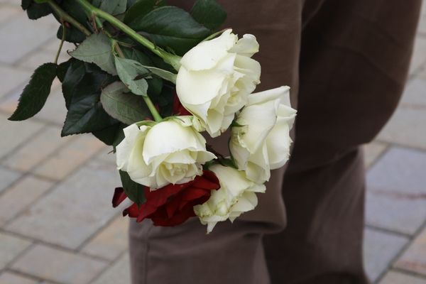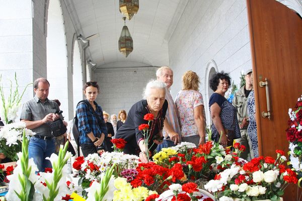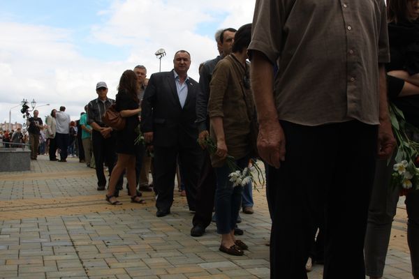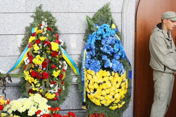 Многие принесли бело-красно-белые букеты, около входа стоял венок от президента Украины Петра Порошенко.