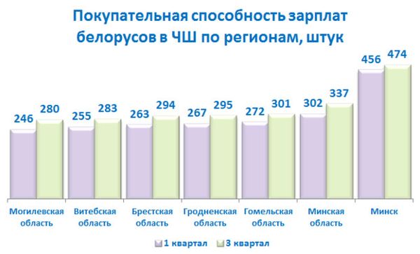 Но во всех регионах, отмечают авторы рейтинга, покупательная способность зарплат в ЧШ в третьем квартале выросла по сравнению с январем-мартом этого года. Больше всего этот показатель увеличился в Минской области (+35 ЧШ по сравнению с первым кварталом).