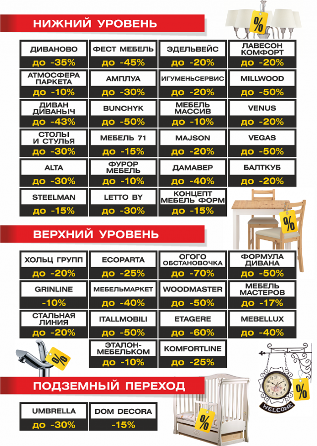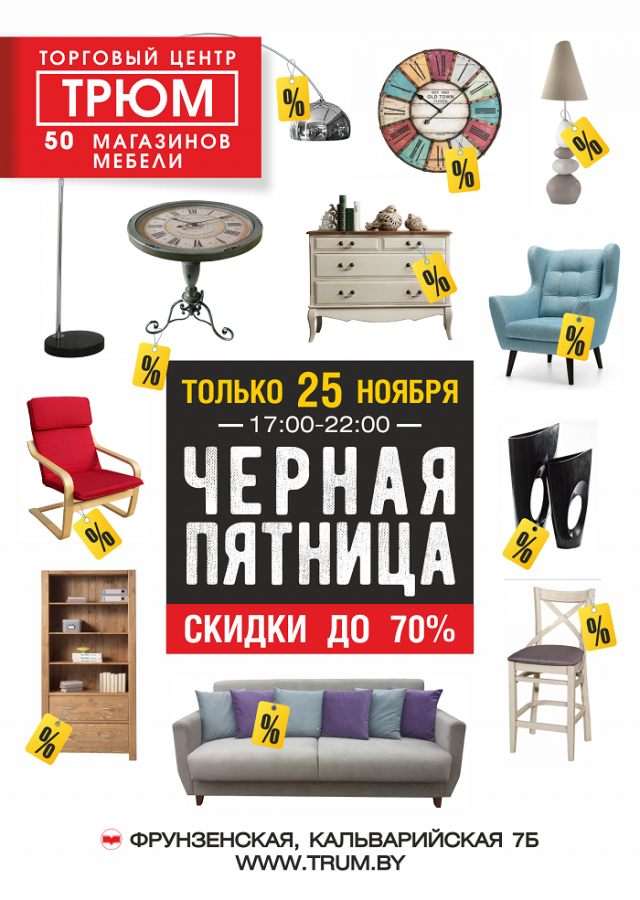 В ТЦ «Трюм» рухнут цены на мебель – кресла, диваны, кровати и готовые коллекции. Кроме того, со скидкой можно будет заказать двери и подобрать сантехнику. Распродажи устроят Italmobili, «Диван Диваныч», «Диваново», «Эдельвейс», Bunchyk, Letto, «Дамавер», Etagere, Vegas, «Лавесон», «Огого обстановочка», «Мебель-Маркет», MebelLux и др. Некоторые магазины планируют снизить цены до 50-70%. С крупным дисконтом можно будет приобрести как выставочные образцы, так и товары из каталогов.