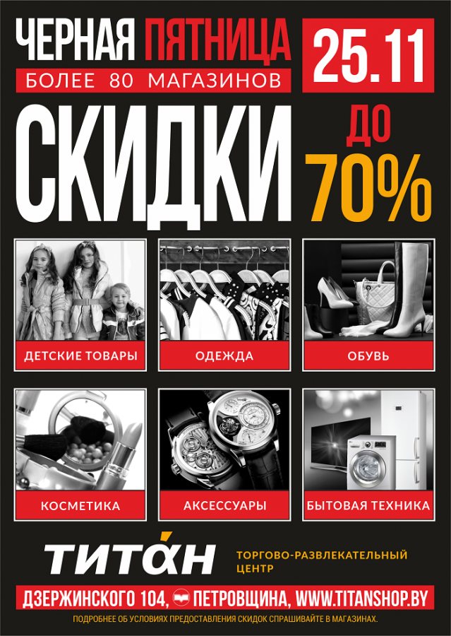 В Минске 25 ноября одновременно с Нью-Йорком, Лондоном и Миланом устроят «черную пятницу». Главная распродажа года пройдет в ТРЦ «Титан» и ТЦ «Трюм», в которых товары подешевеют до 70%, рассказали организаторы.