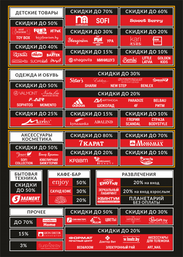 В ТРЦ «Титан» рекордно подешевеют одежда, обувь, бытовая техника, детские товары, косметика и аксессуары. В частности, цены опустят магазины «Пятый элемент», Adidas, Sister’s, Marco, «Кравт», «Мономах», «7 карат», «Буслiк», Chicco, Mothercare, Kari Kids, FUNtastik и «Мой ребенок». В некоторых местах скидки превысят 50%. Например, товары для дома и интерьера, равно как и ювелирные украшения, подешевеют до 80%.